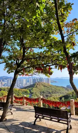 The silver UFO on the mountain peak is so sci-fi! Standing on the transparent viewing deck, you can take in the entire city's mountain and sea outlines—on one side, autumn trees layered like an oil painting, on the other, the blue waves of Bohai Bay rolling under the clouds, with the wind carrying the warm scent of autumn sun-kissed grass and trees~