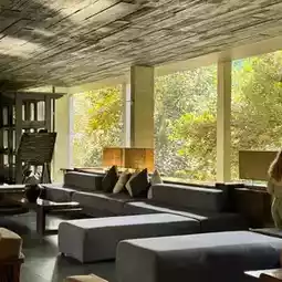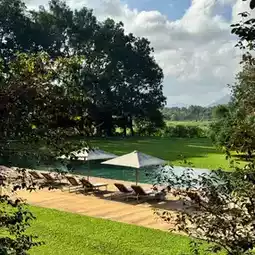 The tables and chairs nestled under the massive trees create an incredible ambiance, whether it's day or night. And the pool? It's like a mirror reflecting the jungle, completely enveloped in greenery. Every window in the room offers beautiful views – you're just immersed in nature!