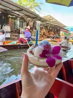 Damnoen Saduak Floating Market is a unique market where souvenirs and food are sold on boats floating on the water 🙋🏻♀️💜It's so much fun to be able to shop and eat while on a boat! 😊The coconut ice cream was especially delicious 🌺This is something you can't easily experience in Japan, so please try it at least once!