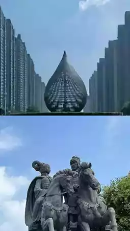 [Pear Blossom Square]: Landmark sculpture + vast pear orchards, stunning light and shadow at dusk