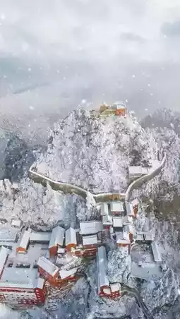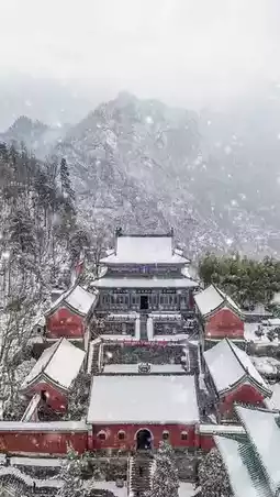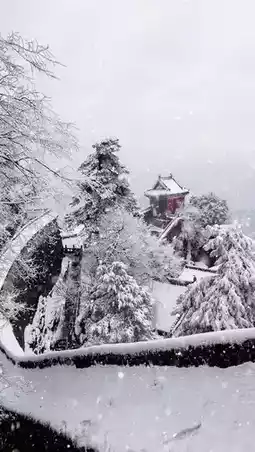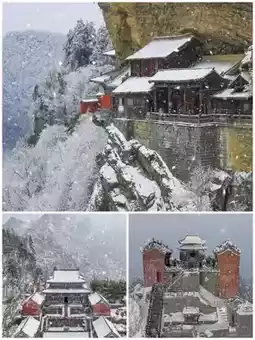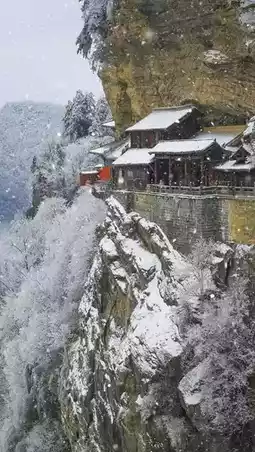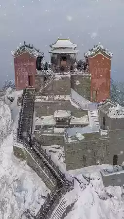 Wudang Mountain is snowing, the eight hundred miles of Wudang is covered in silver, the white snow is everywhere, everything is still, the ancient dan walls and green tiles are still telling the ancient legends.