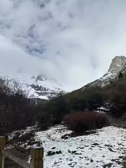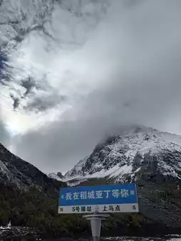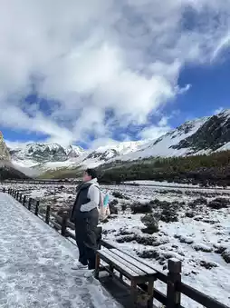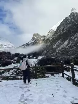 When we reached the entrance of Yading, it started raining again. We were both cold and wet this time. We dragged our luggage in the rain to the bus stop. Luckily, there were some escalators. We took the park bus for about an hour and arrived at our booked accommodation. We still couldn't find the hotel. It was snowing again. This time, we were afraid that our luggage would get wet, so we hurriedly looked for a place to hide from the snow before the hotel staff came to pick us up. When we arrived at the hotel, we sat and watched the snow fall.
