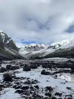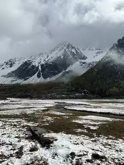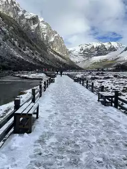The next day, it was the day we were going to walk the long route in the park, and it was as we thought. Everywhere we looked, there was snow. Snow that was shaved ice. Both the grasslands and the mountains were all white. This time, I got to visit Yading in winter, which was beautiful in a different way. Normally, we don't see snow. Walking like this is very nice. The view of Yading is already beautiful, and the white snow makes it even more beautiful.
