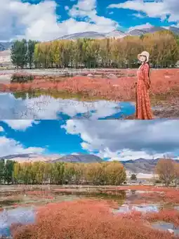 Navigate as above. Every autumn, only for a brief half-month in October, the red grassland dances like flames on the water, while the poplar trees behind don golden coats, lighting up Daocheng’s autumn together. Encountering this is a stroke of luck.
