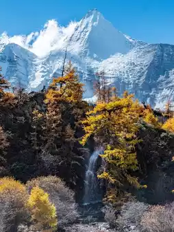 The autumn snow-capped mountains + waterfalls under the blue sky and white clouds are absolutely stunning!