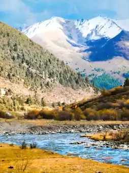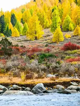 The colorful forest is like a bright and romantic autumn painting. The sunny slope’s colorful forest stretches for several kilometers, with colors shifting from green to yellow in varying tones. The valley’s water is clear and the stone beach wide, perfect for hiking and wading. The scenery here is breathtaking, a paradise for photography enthusiasts.