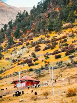 A dreamy fairyland hidden in a secret place, locally called "Que’er Gou Moon Bay," it is a little-known secret spot. The scenery here is stunning, like a paradise on earth. The lake water is crystal clear, surrounded by dense forests and rolling grasslands. A stream gently flows by, and cattle and sheep graze leisurely. Standing here, you can feel the powerful embrace of nature.