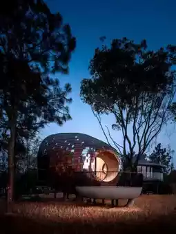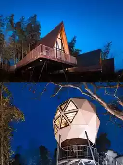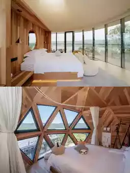 The homestay is located in Yuyao, the birthplace of the Hemudu civilization, backed by primeval forests and adjacent to a millennium-old village. It features 14 guest rooms, 11 triangular treehouses, 1 bird's nest treehouse, 1 starry sky dome treehouse, and 1 RV, with windows that bring the distant mountains and nearby forests into the room.