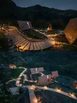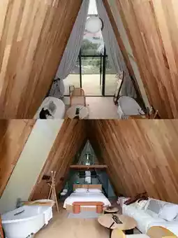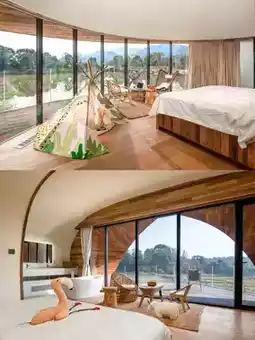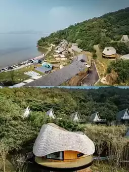The homestay is close to the 2539-hectare Caizi Lake National Wetland Park, with 34 guest rooms, including 5 triangular treehouses, 4 lotus leaf treehouses, 1 bird's nest treehouse, 1 seed treehouse, and 23 cloud dwelling mountain/lake view rooms, scattered among tall trees and shrubs, offering an ultimate luxury wilderness experience.