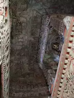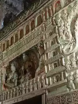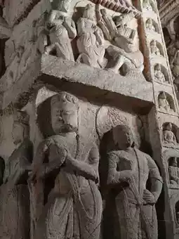 Surrounding the lower level of the pillar and the four walls are dozens of continuous relief carvings that systematically depict the complete life of Shakyamuni—from his conception by elephant incarnation, birth under the tree, prince competitions, midnight city crossing, to enlightenment and preaching.
