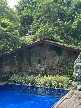Stone-carved Buddha statues greet every traveler, and the steps are surrounded by dense jungle vibes. Descend, and you'll find a stunning azure bay with crystal-clear waters and swaying coconut trees. It's the perfect spot to lounge in a hammock, daydream, and watch the sunlight sparkle on the sea.✨