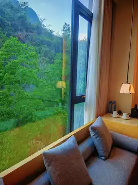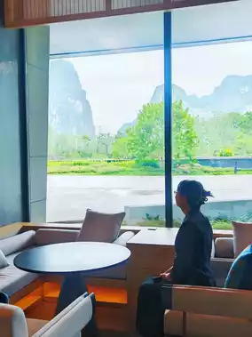 Open the window to breathtaking Guilin-style karst landscapes! Rolling emerald mountains in the distance, lush greenery nearby - it's like living inside an ink painting🎨 The rooftop terrace is a floral wonderland, perfect for sunbathing with mountain views. The infinity pool mirrors the scenery, making every swim feel like gliding through art🏊♀️