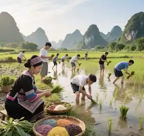 • **Morning**: Join villagers—plant rice in spring, harvest in fall. Get muddy; craft five-color sticky rice (steamed to aromatic perfection).