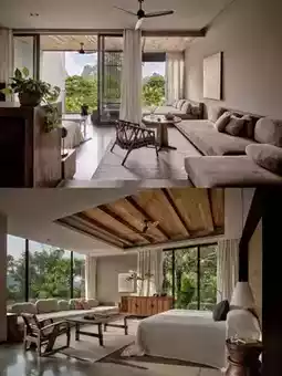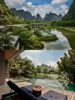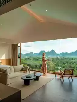 Surrounded by lush tropical vegetation, the resort showcases karst landscapes and pastoral views. Suites feature floor-to-ceiling windows and fully open terraces, embodying the art of "slow travel" and mountain wilderness living.