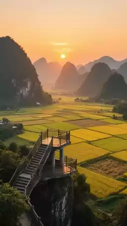 - Climb Mingshi Pavilion viewing platform to watch the sunset, golden rice fields + distant mountain silhouettes