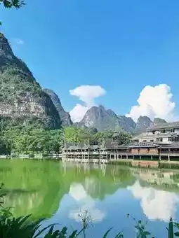 For just a few dozen yuan, I took a bamboo raft ride. The boatman paddled while pointing out sights: "General Mountain," shaped like a general's armor; "Tongtian Cave," where light shines through; and "Wanru Cliff," covered with stalactites. The best part was passing through a Zhuang ethnic village, where white walls and black tiles reflected in the water, bamboo hanging over the riverbank swayed in the breeze, and the shadows danced on the water like a living painting.
