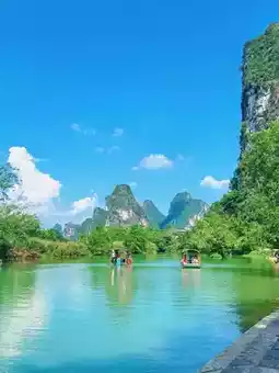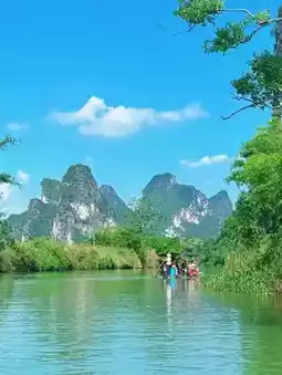 It's about a two-hour drive from Nanning to get here. As soon as you enter the scenic area, you're surrounded by lush greenery—the karst hills look like green bamboo shoots sprouting from the ground, and the Mingshi River winds around the mountains, its water so clear and green you can see the stones beneath. I found out that this river actually flows from Vietnam, and the 8 kilometers within the scenic area hold the most exquisite views.
