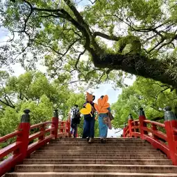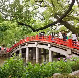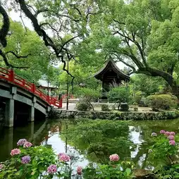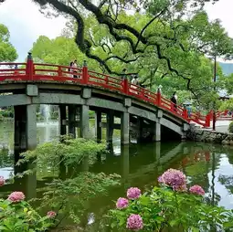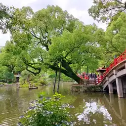 The view around the bridge is very beautiful. The garden is beautifully arranged and each tree has a beautiful shape. It looks valuable. It must be very old. Along with the bright red bridge, it looks very beautiful and impressive. I couldn't resist taking pictures to my heart's content.