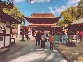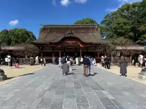 Students come here to pray for success in their exams. This shrine is dedicated to students praying for academic achievement, and it is frequently visited by students for this purpose. A long street leads from the Nishitetsu train station to the shrine, lined with local seasonal delicacies. At the end of the street, near the temple entrance with the bull statue, stands a famous wooden Starbucks. The area is rich with various trees and historical stories. Although the shrine is crowded with praying students and teachers during exam periods, the garden behind the main building offers a peaceful retreat.