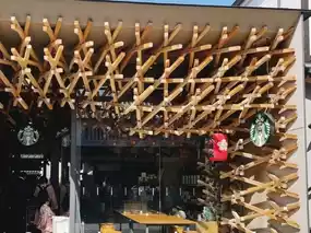 On your way back, make sure to stop at the local Starbucks. Among the many Starbucks cafes nationwide, none is perhaps more famous than the Dazaifu Starbucks in Fukuoka. This stunning building was designed by world-renowned architect Kengo Kuma. The interior of the Dazaifu Starbucks uses about 2,000 pieces of these 'thin woods,' resembling the inside of a giant handwoven basket.