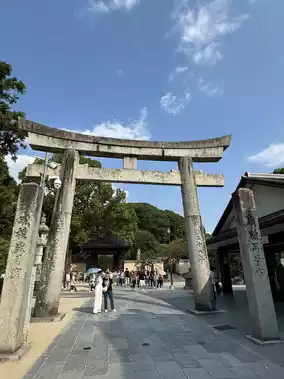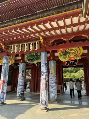 The main shrine of the god of learning, with its vermilion-painted tower gate, drum bridge, and 3-year-only "Floating Forest"