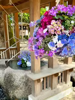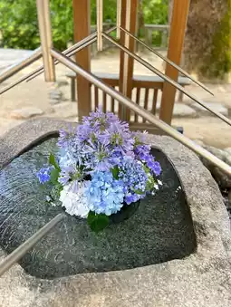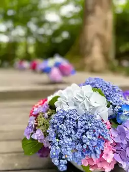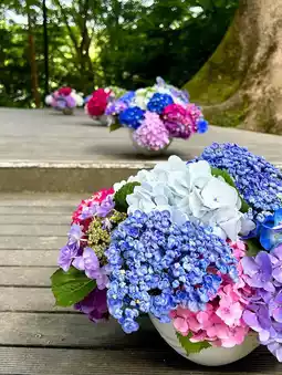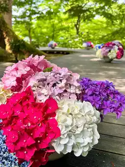 Hydrangeas in various colors such as red, pink, purple, blue, and white are beautifully arranged in round shapes, and even the flower water basins are adorned with hydrangeas♡