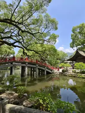In spring, plum blossoms bloom, filling the air with a delicate fragrance; in autumn, maple leaves paint the shrine grounds a vibrant crimson, creating a shimmering light and shadow. Entering the main shrine, a serene and ancient atmosphere is shrouded in incense, where visitors pray for learning and wisdom. Along the surrounding paths, you can savor the famous Dazaifu umegae mochi, a soft, sweet, and fragrant treat that infuses the shrine's culture into your mouth.
