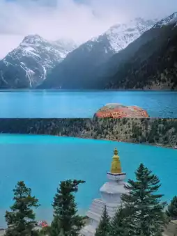 Yulong Lacuo is surrounded by mountain peaks. The tops of the mountains are covered with snow and sparkle in the sunlight. The water of the lake is crystal clear, with the breeze blowing and the waves sparkling. The woods beside the lake are colorful and change colors with the seasons.
