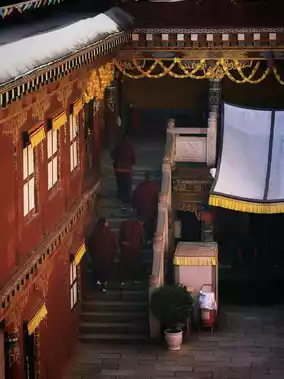 The craftsmen work diligently at their posts. The first floor is where the printing plates are washed, and the second floor is where they are stored. Light streams into the narrow corridor, illuminating the rows of tall cabinets filled with printing plates. It is said that there are 290,000 blocks of Tibetan scripture printing plates here, some of which are the only ones in existence. Up the narrow, almost vertical wooden stairs is an open area around the courtyard, the best-lit area in the printing house, where craftsmen carve and print scriptures.