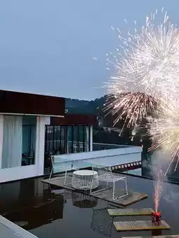 There is also a cloud bistro and viewing platform on the top floor. The hotel will set off fireworks at 7:20pm 🎆 Snow mountain fireworks under the blues are too romantic 🥺 At 8:30 pm you can also watch the Kawagbo documentary 🎬 on the roof