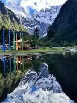 Snowy mountain backgrounds combined with nearby prayer flags make for stunning photos