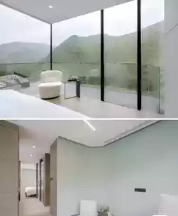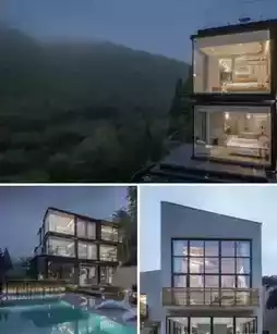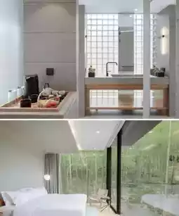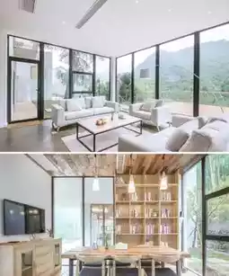 The homestay is surrounded by mountains, with boundless views. The first phase of “Lin Qi” has a sloping roof with a geometric shape, sharp edges and corners, the interweaving of white walls and cement, and the floor-to-ceiling glass windows bring the landscape into the room. The second phase of “Valley Hidden” is like a transparent Rubik's cube, the light color tone and the large floor-to-ceiling windows together create a unique industrial aesthetic feeling, which is integrated with the surrounding natural scenery.