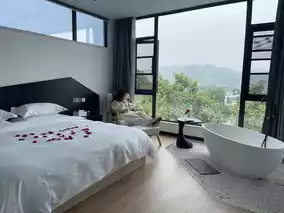 The homestay stands in the center of the scenic area, and the advantage of being quiet in the midst of noise cannot be ignored. The white exterior wall sparkles in the sun, contrasting with the blue sky and the green bamboo sea, creating a quiet and elegant atmosphere. Having the absolute advantage of the building king in the center of the inch of gold scenic area, atmospheric, spacious, eye-catching existence, the lines of the building are simple and smooth, without too much decoration, but not losing the refinement and nobility.