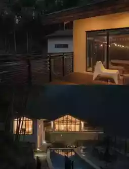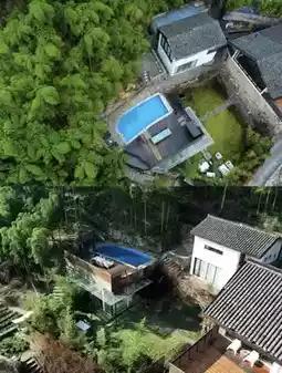 🍃The exterior is simple and rustic, with white walls and green tiles, using the shape of traditional rural houses, retaining a sense of originality. Through the layout of the outdoor space of the homestay, to enhance the accommodation experience. There is a large swimming pool in the courtyard, reflecting the blue sky, white clouds and mountains. The windows and lights are rearranged, you can see large floor-to-ceiling windows and warm yellow lights, to further present the aesthetics of space.