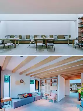 The hotel has three small buildings and twenty-three guest rooms with a variety of different room types, including family rooms, attic rooms and suites. The architectural design follows the principle of natural simplicity, with fresh and nostalgic wood finishes, gray wall and floor tiles, and rustic and warm wall materials, exuding a simple and gentle atmosphere. The rooms are equipped with Kingkoil mattresses, Pacific Coast bedding, Duravit and Hansgrohe bathroom products, and also provide pure natural toiletries extracted from crops produced on the hotel's own farm.