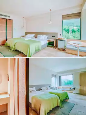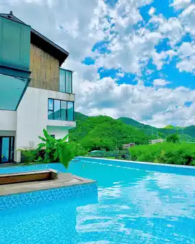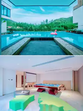 The homestay has multiple indoor and outdoor activity areas. The outdoor area has a scenic swimming pool🏊♀️ and more than 5,000 square meters of activity space, which can provide various experiences such as farming. The book bar is warmly decorated, with sofas and pillows arranged in a circle. The sun shines in, making it a great time to calm down and read. After nightfall, it becomes a small cinema in the mountains. Although the children's playroom is not big, the candy-colored building blocks and balloons 🎈 and the blue-green rocking horse 🎠 are a happy place for little babies.