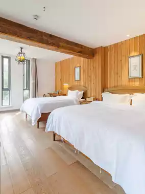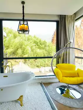 Two elegant buildings are hidden in the 4A-level bamboo forest of Mogan Mountain, where white walls and black tiles complement the lines of the mountains. 19 guest rooms frame the mountain mist and clouds as natural murals, and the log furniture and wabi-sabi style lamps weave a Zen space. Wake up and push open the window, negative oxygen ions wrapped in bamboo fragrance pour in, and every breath carries the gifts of the mountains.