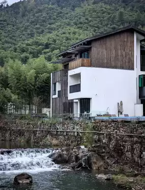 Backed by green mountains and bamboo forests, facing the gurgling stream,