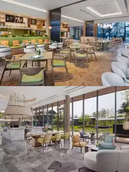 - Dining Services: The Hi Bowl all-day dining restaurant offers breakfast, lunch, and dinner in a trendy and vibrant setting. Enjoy a meal with a river view. Accompanying children under 12 years old can enjoy the "Kids Stay and Eat Free" offer. The Nan Hui Hall Chinese restaurant offers elegant private rooms with views of the ancient canal, perfect for private dining, banquets, and gatherings. The restaurant uses fresh, seasonal ingredients to create innovative fusion dishes that combine traditional Chinese cuisine with local Xinshi flavors.