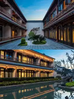 - Architecture and Design Style: The hotel consists of 11 courtyards that blend the style of Jiangnan gardens and water towns, creating a modern interpretation of a traditional Jiangnan mansion. The interior design, by HBA, follows the design concept and elements of the new generation of Holiday Inn Express hotels. Integrating the local culture of Xinshi Ancient Town, the design incorporates details such as boat-shaped and bamboo leaf-shaped chandeliers, echoing the water town and bamboo forest surroundings.