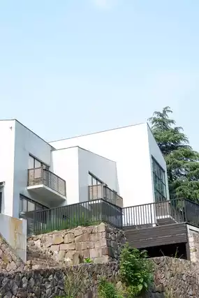 ▫️ Roof mountain skyline: The designer deconstructed the old house into geometric shapes, and the roof undulations echo the distant mountains. An aerial drone shot looks like Lego bricks scattered in the bamboo forest.