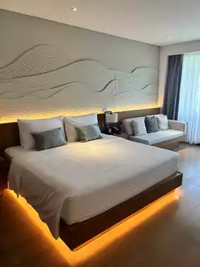 The resort features restaurants, activity centers, free Wi-Fi, yoga sessions, and additional services such as room service. Due to its large size, electric cars are available to transport guests between their rooms and the reception area. The resort is adorned with numerous fruit trees, and guests can enjoy complimentary fresh fruit in their rooms!