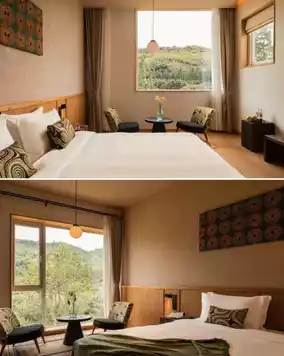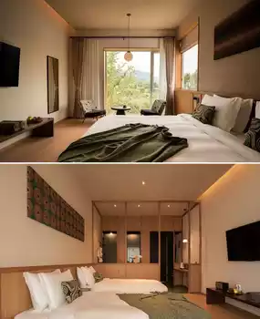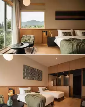 Sixteen white houses are naturally scattered in the mountains and fields at a residential scale, both avant-garde and secluded. Public spaces include a restaurant, café, handmade workshop, art exhibition area, and more, providing travelers with an immersive experience. The interior resembles a "South of France garden museum," displaying vintage furniture collected globally by the founder—leather chairs, storage cabinets, ceramic flower vessels—with greenery entwined and light and shadow flowing, each frame like a magazine spread.