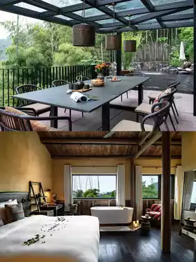 The rooms are truly heart-stealing! Three sides of huge floor-to-ceiling windows🪟, pull back the curtains to see endless green hills, like moving your bed right into the bamboo sea, healing you every second~ The room also has a bathtub🛁, soak while watching the mountain view outside the window, the experience is top-notch!