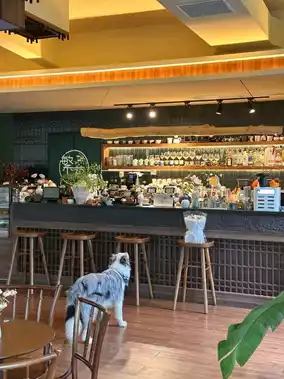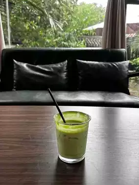 Sipping iced matcha while a friendly pup wandered by the bar—proof that cozy corners and simple pleasures are often the best part of the journey.