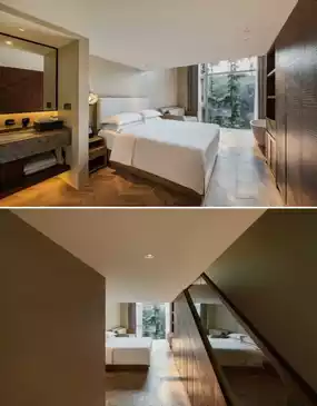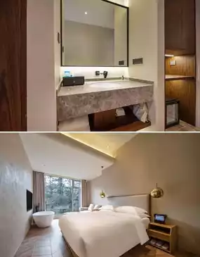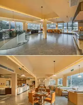 The two hotels share a Chinese restaurant and a Western restaurant. The lakeside restaurant has floor-to-ceiling windows facing the forest and lake views, offering creative Zhejiang cuisine and local ingredients (recommended dishes include dried bamboo shoot casserole and reservoir fish head soup). Breakfast is served buffet style, with a rich variety of Chinese and Western dishes to choose from. In the evening, you can visit the Suspended Swimming Bar next to the 33-meter-high pool, enjoy specially crafted cocktails with the sunset, and feel as if you are floating among the clouds.