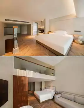 The hotel centers around the concept of "suspended swimming." The entire resort features 208 scenic swimming pools (a Guinness World Record challenge level!), including Asia’s first 33-meter-high suspended glass pool, like a blue ribbon tied between the mountains. Looking down, you can see forest ravines; looking up, you can touch flowing clouds and stars. The architecture blends blue and white tones with greenery, with 88 villas scattered throughout. White sandy beaches, red sailboats, a water chapel, treetop houses, and glass plank bridges decorate the area—every step is a scenic view.