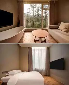 The hotel is located at Louis Lake in Wusi Village, Mogan Mountain, Deqing, Zhejiang. It is about a 2.5-hour drive from Shanghai, only 1 hour from Hangzhou, and approximately 17 km from Deqing High-Speed Rail Station. The entire route is filled with healing mountain scenery, perfect for a weekend getaway! Traveling through the bamboo sea highway, turning into a private mountain path, you are instantly isolated from the hustle and bustle—before you lies the rippling Dream Creek Lake, and behind you stretches a continuous forest oxygen bar, truly achieving "adventure outside, seclusion inside."