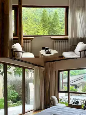 Biyin is located halfway up the mountain in Moganshan Town, surrounded by lush bamboo forests, with the air filled with the fresh scent of plants. The decor is a minimalist new Chinese style, with wooden furniture paired with floor-to-ceiling windows that frame the mountain views like paintings. The rooms are equipped with thoughtful amenities like Dyson hairdryers, combining style with comfort.