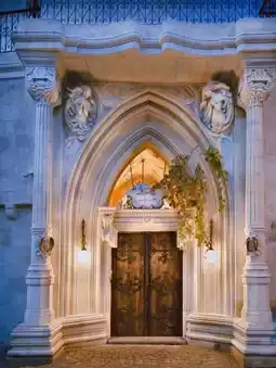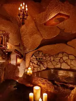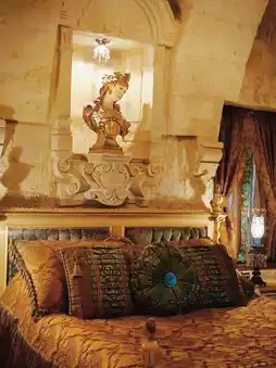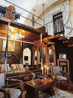 The entire courtyard and room are full of medieval style details. Climbing vines on century-old trees, various totems of the grouper genus Medusa... When night falls, a vampire castle comes to life 🏰.